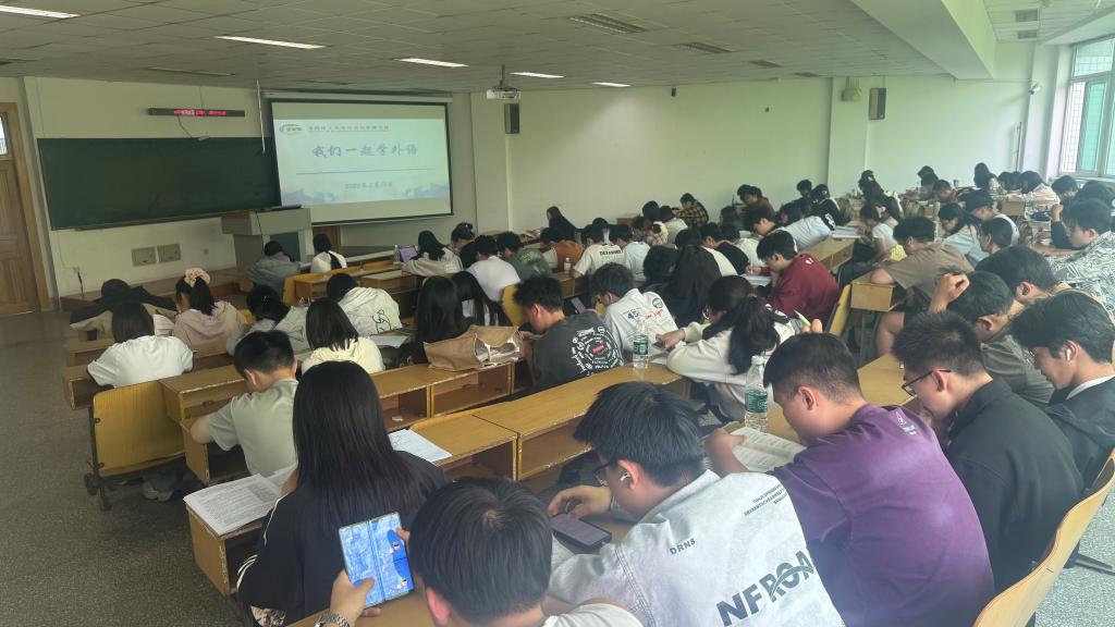 自5月14日起,辅导员王怀组织2023级百余名报考四六级的学生,利用每周三下午,定期开展“我们一起学外语一小时”集中学习活动。通过这种形式,将同学们组织在一起做真题、记单词、背短语,形成比、学、赶、超的浓厚学习氛围,极大提升了同学们的学习效率。