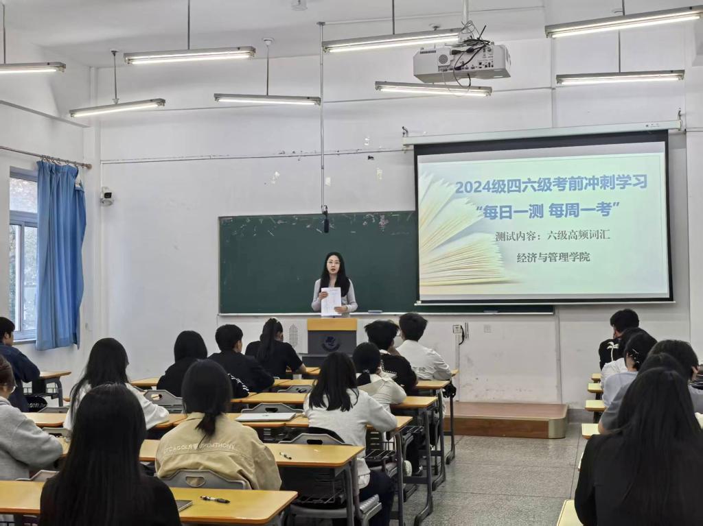 结合学生实际情况,辅导员张国平利用晚自习,带领学生开展四六级高频词汇专项训练和测试,每周开展模拟考试,专人监考专人判卷。通过“每日一测,每周一考”的学习形式,既有效提升了学生四六级词汇知识点把握,还帮助学生提前体会考试氛围,夯实了语言根基,又淬炼迎考心志,以“沉浸式”陪伴养成2024级学生自主学习习惯与科学备考思维。